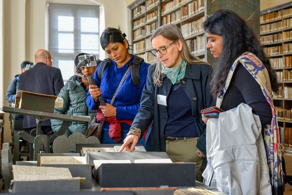 Die Mitbegründerin und Präsidentin der Tamil Heritage Foundation International, Dr. Subashini Kanagasundaram, besuchte uns am Freitag, dem 28.03.2025, mit einer Gruppe in Deutschland lebender Wissenschaftler:innen aus Indien. Das ganztägige Programm sah Führungen in der Bibliothek und dem Archiv mit Zeit zum Lesen der tamilischen Drucke, Handschriften und Palmblatthandschriften im Lesesaal vor und erlaubte einen Einblick in die kulturelle und Bildungsarbeit der Franckeschen Stiftungen. Die IT-Spezialistin und Autorin hatte die Reise nach Halle initiiert, um den Mitgliedern die Geschichte der Beziehungen der Franckeschen Stiftungen zu Indien vorzustellen und ihnen die Möglichkeit zu geben, einen Einblick in die Quellen der Dänisch-Halleschen Mission zu nehmen. Die Teilnehmer:innen befragten im Quellenstudium die vorbereiteten Materialien nach ihren verschiedenenen Forschungsschwerpunkten wie Religion, Botanik oder tamilische Sprachwissenschaft. In den Gesprächen mit den Mitarbeiter:innen vor Ort entstanden viele neue Kooperationsideen. Besonders interessiert ist die Foundation auch an einer Zusammenarbeit mit dem Museum für den interkulturellen Austausch im Ziegenbalg-Haus in Tharangambadi.