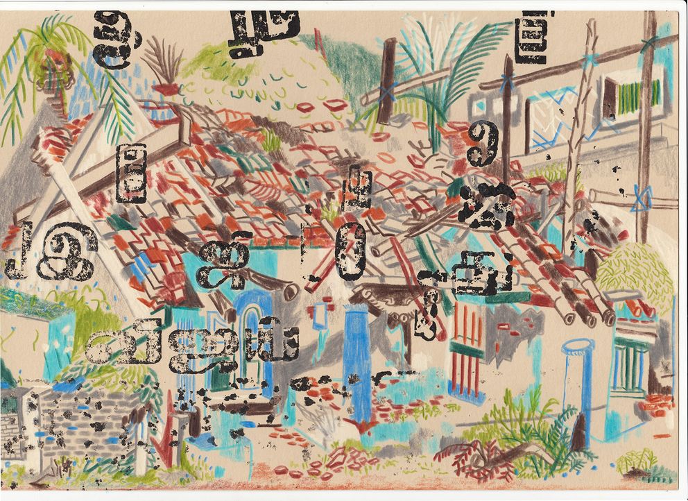 In der Goldsmith Street entdecke ich ein verfallenes, traditionelles tamilisches Wohnhaus. Da es gerade nicht regnet, stelle ich meinen Stuhl kühn mitten auf die Straße und beginne mit meiner Zeichnung. Das zusammengefallene Ziegeldach lässt den Blick auf die Dachkonstruktion aus Bambusstämmen und die Ziegelsteinwände frei. Auf Nachfrage erfahre ich, dass dieses Haus nach dem verheerenden Tsunami im Jahr 2004 von den Bewohnern verlassen wurde. Auch ich verlasse jetzt fluchtartig meinen Platz, weil die ersten Regentropfen auf mein Papier fallen. Glücklicherweise entdecke ich in der Nähe die überdachte Einfahrt eines Wohnhauses, das nach dem Tsunami gebaut wurde. Von hier kann ich entspannt und von einer guten Position aus zeichnen. Von Minute zu Minute wird der Regen intensiver und ich rutsche mit meinem Stuhl immer weiter in die Garage hinein. [...] Dabei lerne ich auch den Nachbarn kennen, der aus Nepal stammt. Vor kurzer Zeit hat er sich ein Haus direkt am Meer gekauft, angstfrei vor einem weiteren Tsunami. [...] Auf dem Rückweg erkenne ich die Goldsmith Street nicht wieder. Die Straße hat sich jetzt zu einem »Goldsmith-Stausee« verändert und ich stapfe vorsichtig durch knöcheltiefes Wasser.
