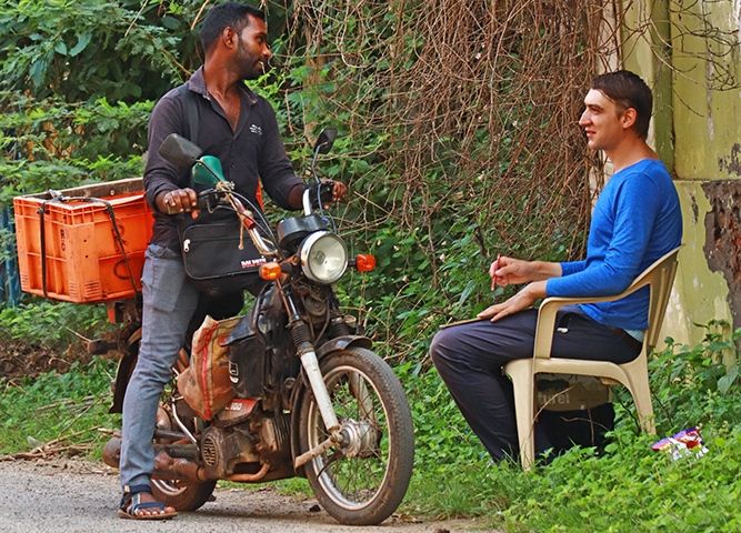 Minuten später setze ich meinen Weg fort und begegne zahlreichen Schülern in ihren unterschiedlichen Schuluniformen. Einige erkennen mich wieder und grüßen mich im Vorbeigehen. Im Nieselregen erreiche ich die Marktstraße und setze mich regengeschützt unter einen Balkon. Vor mir tuckert, quietscht, hupt und faucht der morgendliche Berufsverkehr auf der mit Schlaglöchern übersäten Marktstraße. Die Rollläden von Sultans »Danish Shop« sind noch geschlossen. Schnell werde ich von aufmerksamen Passanten angesprochen. Einer von ihnen heißt Vijay und ist ein junger Fischer. Unmittelbar nebenan bemerke ich ein Gebäude, in dem sich eine Tankstelle befindet. Das Benzin wird hier literweise in Plastikflaschen verkauft und direkt in die Tanks gegossen. Gegen 9:00 Uhr öffnet Sultan seinen Laden und winkt mir dabei grüßend zu. Wenig später begegne ich einem Fotografen, der in der Nähe ein Studio betreibt. Ich erfahre von seiner Zeit als Angehöriger der indischen Armee, und wir verabreden uns zu einem weiteren Zusammentreffen. Sultan kehrt zurück und freut sich sehr über meine Zeichnung.